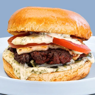 100% POURIKKOS pastourmas patty, halloumi, juicy tomato, fresh lettuce, tangy pickles, and our verde zesty mayo touch.